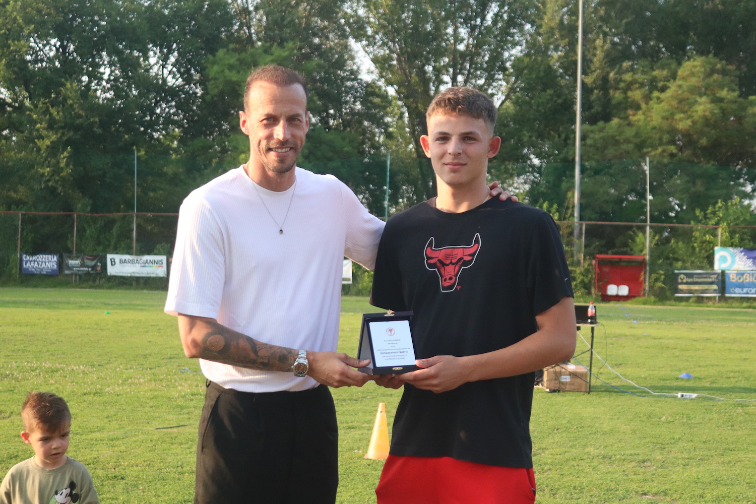 Τιμητική πλακέτα δόθηκε και στον πάλαι ποτέ παράγοντα των Α.Ο. Αμπελοκήπων, κ. Νίκο Μπαρμπαγιάννη, ο οποίος παρακολουθεί από κοντά τις προπονήσεις του εγγονού του πλέον στην ακαδημία των Αμπελοκήπων, ενώ μια φανέλα της ακαδημίας με την επωνυμία της επιχείρησης του παρέλαβε ο κ. Μπούτλας ο οποίος ήταν χορηγός τόσο στην αγωνιστική φανέλα της Κ16, προσφέροντας στον σύλλογο επίσης έναν απινιδωτή.