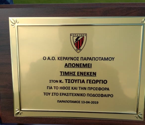 Πριν από την έναρξη του αγώνα τιμήθηκε από τη διοίκηση του Κεραυνού Παραποτάμου ο γιατρός και ποδοσφαιριστής του Ολύμπου Γόννων, Γιώργος Τσούγιας για τη προσφορά του και το ήθος του στο Ερασιτεχνικό ποδόσφαιρο. Κινήσεις οι οποίες αξίζουν της ανάλογης προβολής μιας και «σπανίζουν» στις μέρες μας.