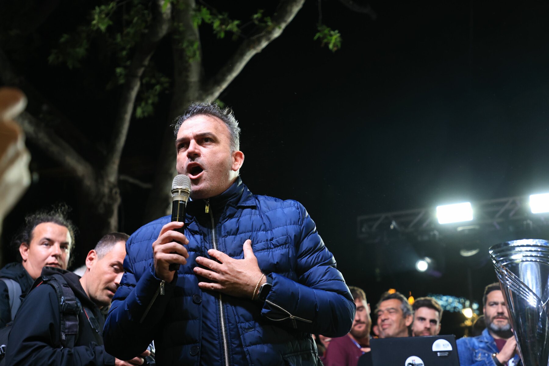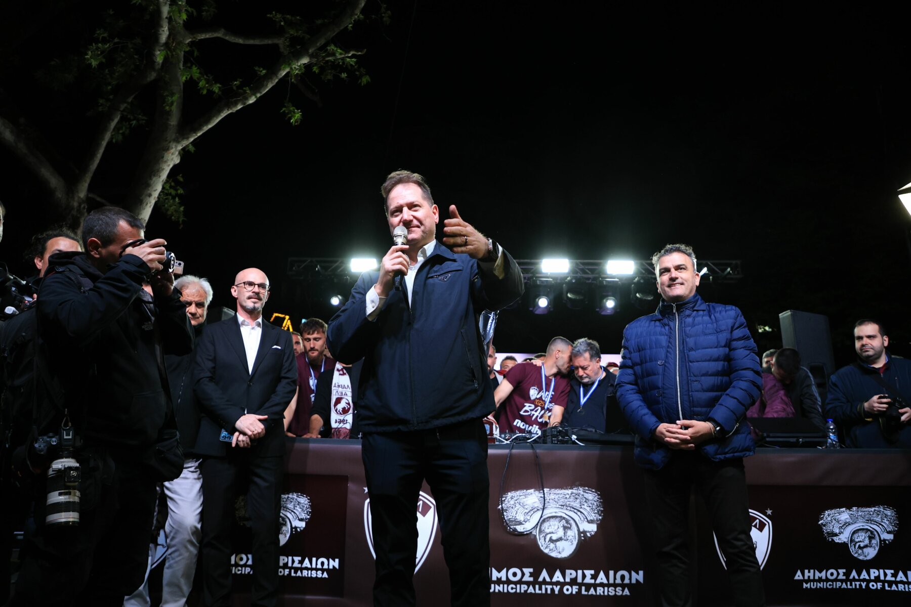 Ευτυχισμένος και γεμάτος χαμόγελα ήταν τόσο ο Δήμαρχος Λαρισαίων, Θανάσης Μαμάκος, όσο και ο Πρόεδρος της ΠΑΕ ΑΕΛ, Αχιλλέας Νταβέλης μιλώντας στο κόσμο της ΑΕΛ που συγκεντρώθηκε στην Κεντρική Πλατεία.