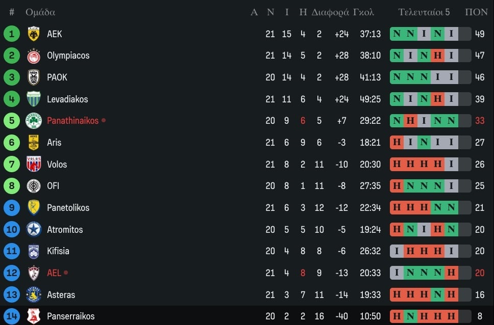 Παράλληλα, στο παιχνίδι που έριξε την αυλαία της 21ης αγωνιστικής, ο Παναθηναϊκός έμεινε στο 1-1 με την ΑΕΛ, με τους «πράσινους» να πετούν την ευκαιρία να πλησιάσουν το Λεβαδειακό.