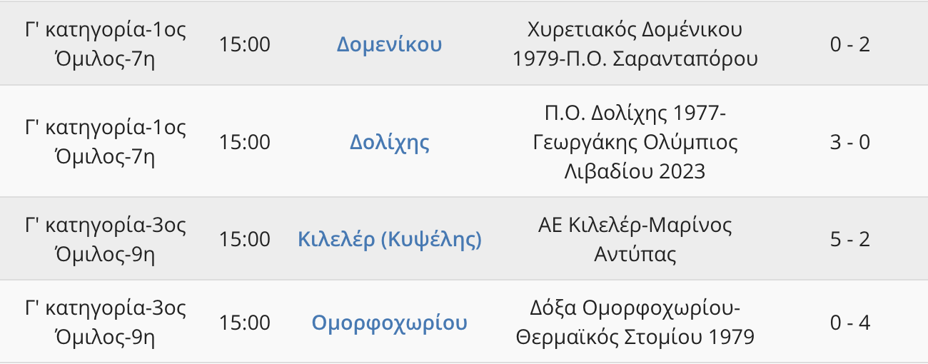 9η Αγωνιστική στον 3ο Όμιλο της Γ’ ΕΠΣ Λάρισας και στο πρώτο μισό (αύριο η συνέχεια), η Α.Ε. Κιλελέρ επικράτησε με 5-2 του Μαρίνου Αντύπα, ενώ ο Θερμαϊκός Στομίου επικράτησε με 0-4 της Δόξας Ομορφοχωρίου.