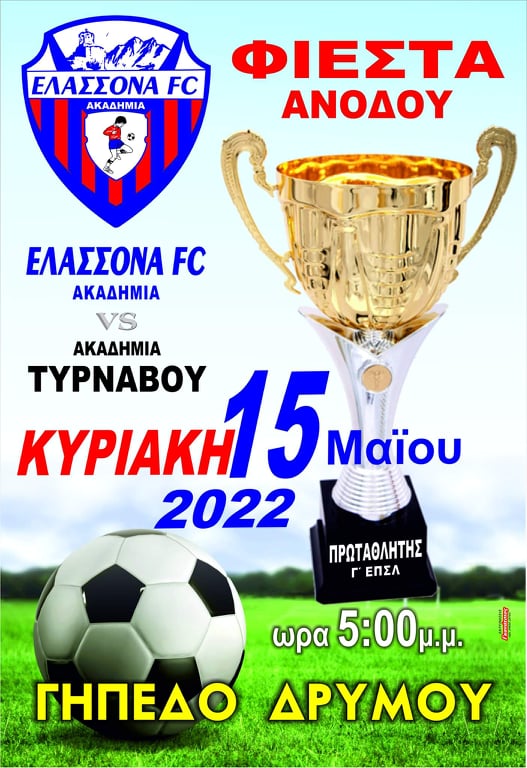 «Η Ακαδημία Ποδοσφαίρου Ελασσόνας προσκαλέι όλους του φιλάθλους της πόλης και της επαρχίας Ελασσόνας την Κυριακή 15/05/22 και ώρα 17:00 στο τελευταίο αγώνα – φιέστα του πρωταθλήματος .