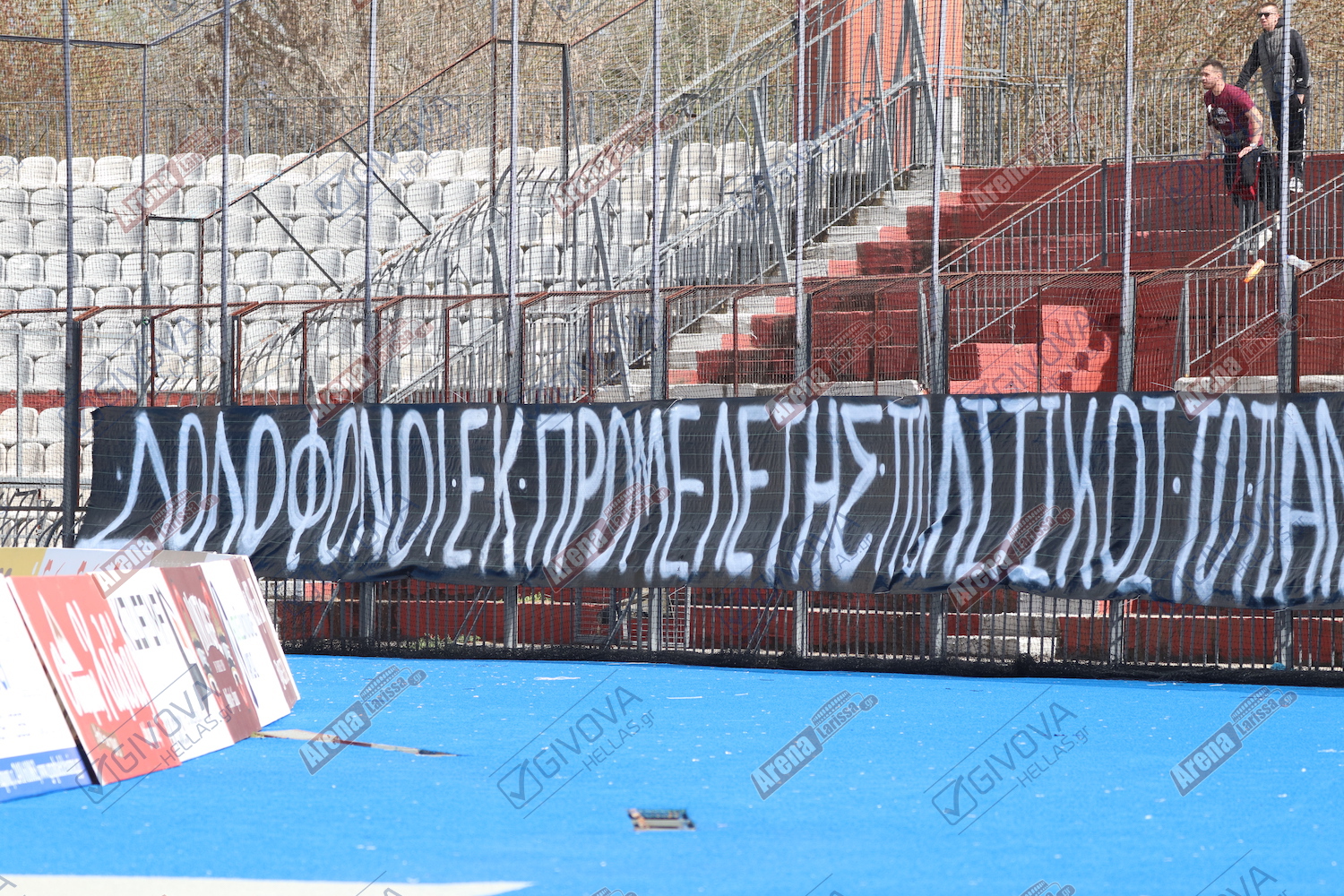 Η διαμαρτυρία αυτή όμως δεν φάνηκε να βρίσκει σύμφωνο τον διαιτητή της αναμέτρησης Ιωάννη Παπαδόπουλο, ο οποίος ενημέρωσε πως πρέπει να κατέβουν τα πανό για να ξεκινήσει το ματς. Κάτι τέτοιο όμως δεν συνέβη ποτέ, ο κόσμος στις εξέδρες αντίθετα «γιούχαρε» τον διαιτητή, ο οποίος εν τέλει με εννιά λεπτά καθυστέρηση, έδωσε εντολή για τη πρώτη σέντρα.