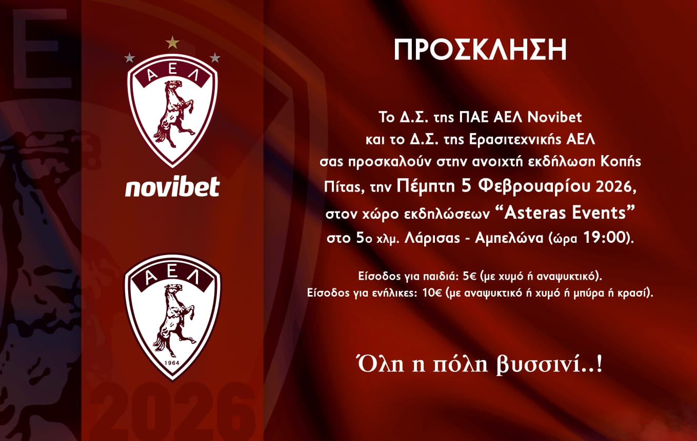 Το Διοικητικό Συμβούλιο της ΠΑΕ ΑΕΛ και το Διοικητικό Συμβούλιο της Ερασιτεχνικής ΑΕΛ, μαζί με όλα τα τμήματα και όλα τα αθλήματα του συλλόγου μας, θα πραγματοποιήσουν την καθιερωμένη κοπή της πρωτοχρονιάτικης πίτας την Πέμπτη 5 Φεβρουαρίου 2026, στις 19:00, στον χώρο εκδηλώσεων «Asteras Events» (5ο χλμ Λάρισας – Αμπελώνα).