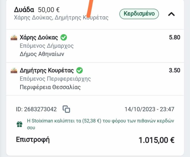 Ένας εξ’ αυτών ο Λαρισαίος που έσπευσε να ποντάρει 50 ευρώ στο ενδεχόμενο να εκλεγούν στον Δήμο Αθηναίων ο Χάρης Δούκας και στην Περιφέρεια Θεσσαλίας ο Δημήτρης Κουρέτας.