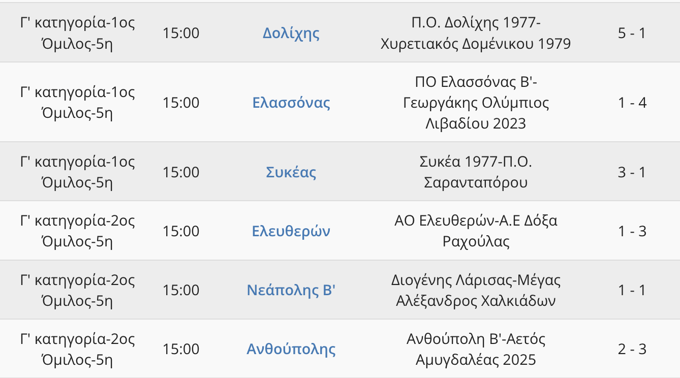 Δείτε τα Αποτελέσματα της 5ης Αγωνιστικής σε 1ο και 2ο Όμιλο της Γ’ ΕΠΣ Λάρισας…