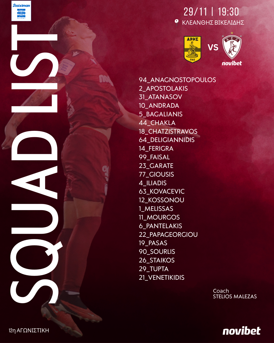 «Ολοκληρώθηκε το πρωί της Παρασκευής (28/11) η προετοιμασία της ΑΕΛ Novibet για τον αγώνα Πρωταθλήματος με αντίπαλο τον Άρη στο «Κλεάνθης Βικελίδης» για την 12η Αγωνιστική της Stoiximan Super League (29/11, 19:30).