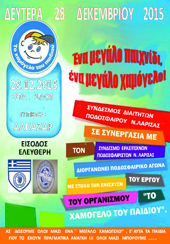 Την 28η Δεκεμβρίου 2015, ημέρα Δευτέρα και ώρα 15:00, στο στάδιο Αλκαζάρ, ο Σύνδεσμος Διαιτητών ποδοσφαίρου Νομού Λάρισας σε συνεργασία με τον Σύνδεσμο Ερασιτεχνών ποδοσφαιριστών Νομού Λάρισας, διοργανώνουν ποδοσφαιρικό αγώνα, με στόχο την ενίσχυση του έργου του οργανισμού “Το Χαμόγελο του Παιδιού”.