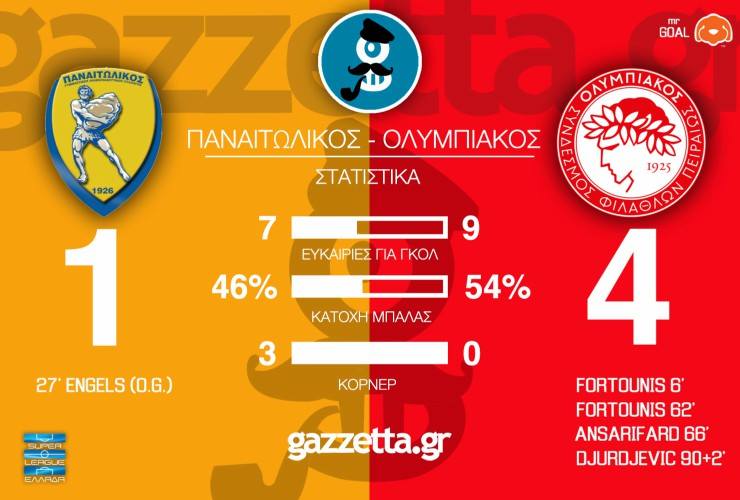 Τελευταίο μέρος του προγράμματος παίχτηκε στο Αγρίνιο. Εκεί ο Ολυμπιακός βρήκε σκορ νωρίς-νωρίς με τον Φορτούνη, που έφτασε τα 50 γκολ στο πρωτάθλημα και έβαλε σε θέση οδηγού τους «ερυθρόλευκους». Το αυτογκόλ του Ένγκελς έφερε το παιχνίδι στα ίσια, αλλά η αντίδραση των Πειραιωτών ήταν καίρια και η κυριαρχία τους καθολική, ώστε να καταφέρουν να φύγουν με μεγάλη νίκη με 1-4 από τη δύσκολη έδρα της ομάδας του Μάκη Χάβου, ανεβαίνοντας ξανά στην κορυφή της βαθμολογίας, έστω προσωρινά!