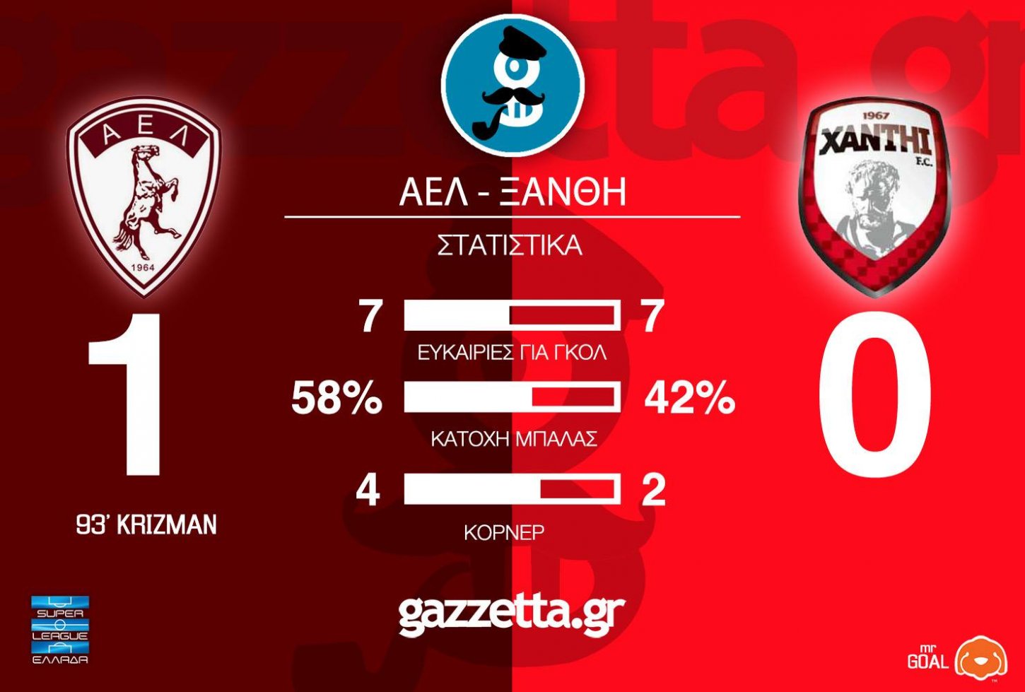 Στη Λάρισα, η ΑΕΛ «μίλησε» την τελευταία στιγμή, με τον Κριζμάν να σκοράρει σε μια από τις τελευταίες φάσεις του αγώνα, κάνοντας το 1-0 κι ανεβάζοντας την ομάδα του στην 7η θέση με 17 βαθμούς! Ο Φυντάνης πανηγύρισε και στη συνέχεια… πλακώθηκε με τον Κούγια, πριν διαψεύσουν αμφότεροι όσα κατέγραψε η κάμερα!